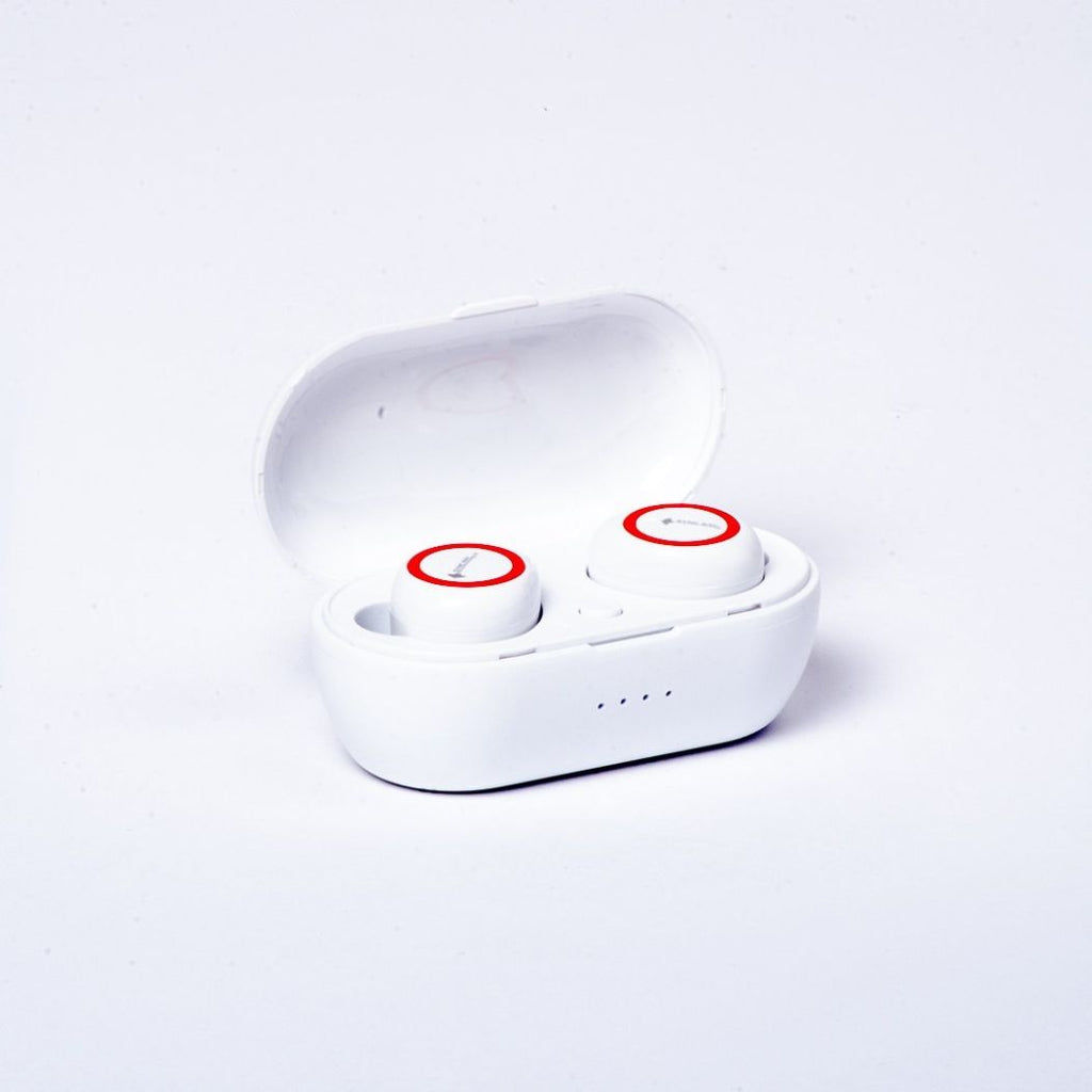 Audífonos True wireless ideales para escuchar tu música favorita sin necesidad de cables, incluye un estuche portable para almacenar auriculares que a su vez funciona como cargador portátil, excelente calidad de sonido.